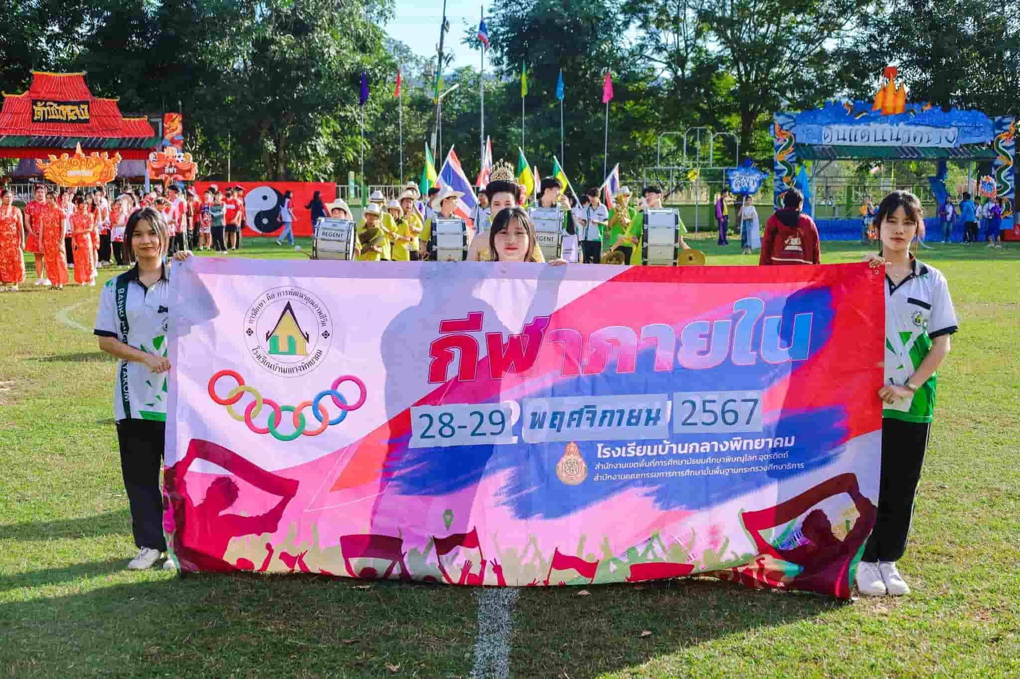 วันที่ 28-29 พฤศจิกายน พ.ศ.2567 ว่าที่ร้อยตรีประสพโชค โพธิ์ทอง ผู้อำนวยการโรงเรียนบ้านกลางพิทยาคม นางนวสิริลักษณ์ โพธิบุตร รองผู้อำนวยการโรงเรียนบ้านกลางพิทยาคม คณะครูโรงเรียนบ้านกลางพิทยาคม จัดกิจกรรมกีฬาสีภายใน ปีการศึกษา 2567 ได้รับเกียรติจากนายจง ผลนาค ผู้ทรงคุณวุฒิคณะกรรมการสถานศึกษา เป็นประธานในพิธี เพื่อให้ส่งเสริมนักเรียนได้ใช้เวลาว่างให้เกิดประโยชน์ในการเล่นกีฬา ฝึกซ้อมกีฬา ได้ลงมือปฏิบัติกิจกรรมด้วยตนเอง อีกทั้งปลูกฝังให้นักเรียนมีน้ำใจนักกีฬา รู้แพ้ รู้ชนะ รู้อภัย ณ โรงเรียนบ้านกลางพิทยาคม อำเภอวังทอง จังหวัดพิษณุโลก |