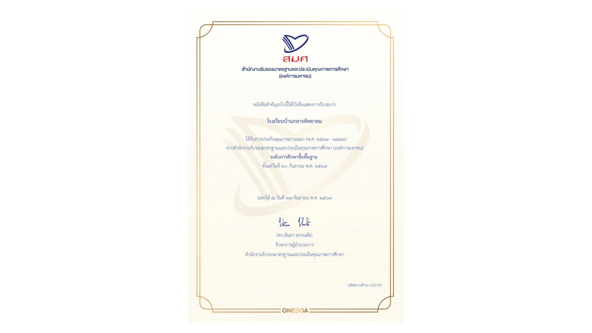คณะกรรมการการศึกษาขั้นพื้นฐาน มอบเกียรติบัตรฉบับนี้เพื่อแสดงว่า โรงเรียนบ้านกลางพิทยาคม สำนักงานเขตพื้นที่การศึกษามัธยมศึกษาพิษณุโลก อุตรดิตถ์ ได้ผ่านการประเมินการบริหารจัดการด้วยระบบคุณภาพตามเกณฑ์รางวัลคุณภาพแห่งสำนักงานคณะกรรมการการศึกษาขั้นพื้นฐาน (Off 06 มี.ค. 68