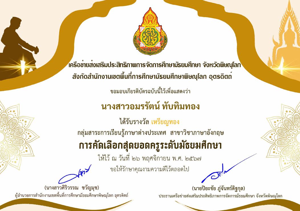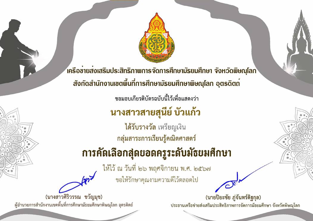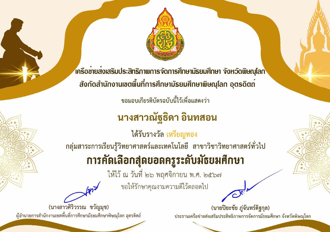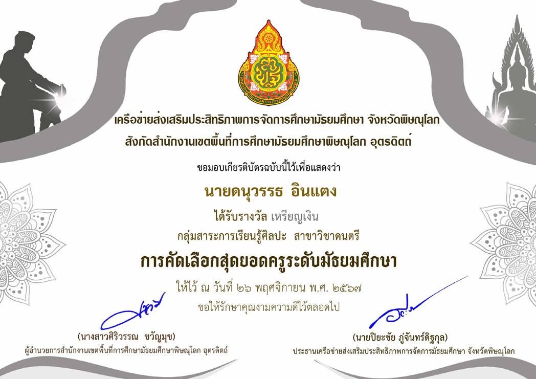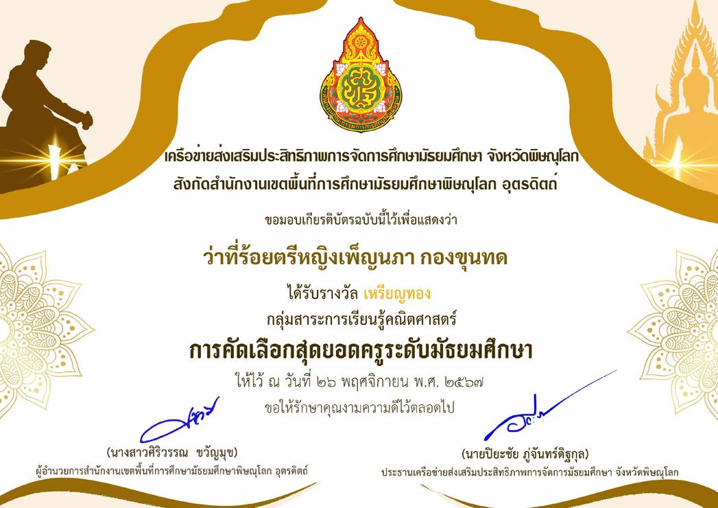 ได้รับรางวัล เหรียญทอง กลุ่มสาระการเรียนรู้วิทยาศาสตร์และเทคโนโลยี สาขาวิชาคอมพิวเตอร์และปัญญาประดิษฐ์ การคัดเลือกสุดยอดครูระดับมัธยมศึกษา เครือข่ายส่งเสริมประสิทธิภาพการจัดการศึกษามัธยมศึกษาจังหวัดพิษณุโลก สังกัดสำนักงานเขตพื้นที่การศึกษามัธยมศึกษาพิษณุโ |