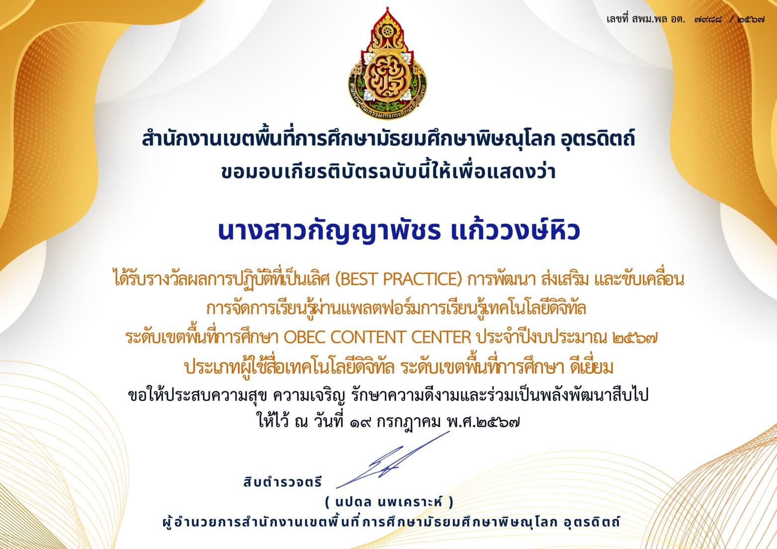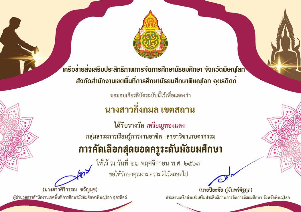 ได้รับรางวัล เหรียญทอง กลุ่มสาระการเรียนรู้วิทยาศาสตร์และเทคโนโลยี สาขาวิชาคอมพิวเตอร์และปัญญาประดิษฐ์ การคัดเลือกสุดยอดครูระดับมัธยมศึกษา เครือข่ายส่งเสริมประสิทธิภาพการจัดการศึกษามัธยมศึกษาจังหวัดพิษณุโลก สังกัดสำนักงานเขตพื้นที่การศึกษามัธยมศึกษาพิษณุโ |